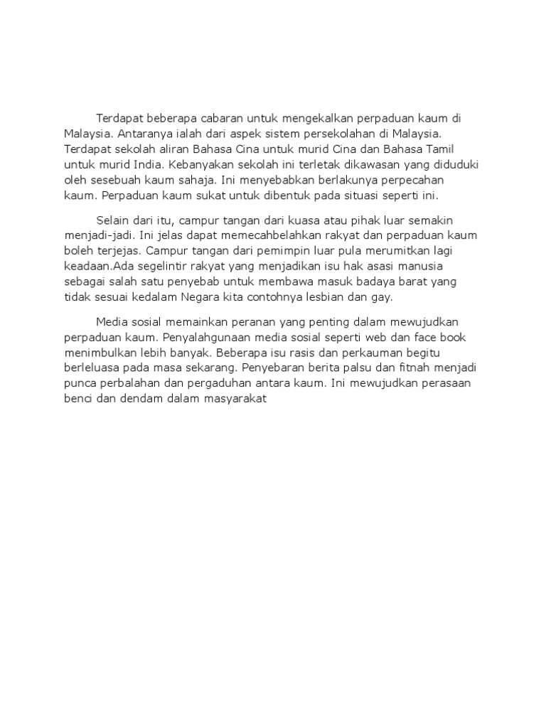 Peranan persatuan mengikut kaum dalam sumbangannya. Untuk mengekalkan perpaduan suatu cabaran yang sangat mencabar dan memerlukan suatu tempoh yang lama penubuhan sekolah kebangsaan (sk) telah diilhamkan oleh para pemimpin negara sebagai wahana untuk perpaduan rakyat pelbagai kaum. Sistem persekolahan pelbagai aliran hanya akan menambahkan lagi jurang perpaduan kaum. Cabaran dalam mengekalkan perpaduan kaum dan langkah mengatasi. Ekonomi dan pembangunan negara akan stabil sekiranya wujud perpaduan dan kerjasama antara semua kaum.