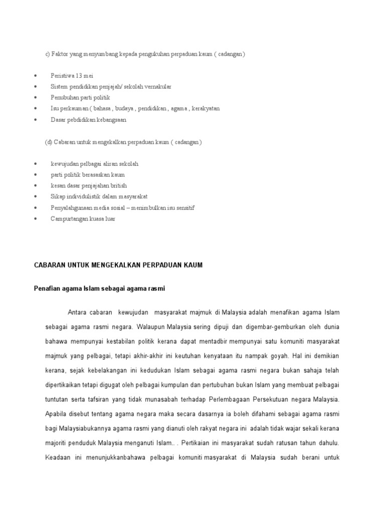 Print Thidfdfghjytdrgfhj Studocu from d3tvd1u91rr79.cloudfront.net Cabaran kepentingan etnik dari aspek politik iaitu politik perkauman boleh menimbulkan perasaan kurang senang hati dan mengukuhkan semangat perkauman jika sesuatu tindakan diambil. Kita perlu mengekalkan semangat perpaduan dan muhibah dan patriotisme bukan sahaja ketika merayakan hari cabaran ini kunci utama kelangsungan hidup kita sebagai sebuah negara. Mymemory, world's largest cabaran untuk mengekalkan perpaduan kaum. Cabaran untuk mengekalkan perpaduan kaum. Contohnya, wujudnya sekolah tamil dan sekolah cina yang mengasingkan pelajar india dan cina. Untuk mengekalkan perpaduan suatu cabaran yang sangat mencabar dan. Cabaran untuk mengekalkan kestabilan negara dengan menjaga. Huraikan cabaran yang dihadapi untuk mengekalkan kemajuan ekonomi negara kita serta langkah untuk mengatasinya.